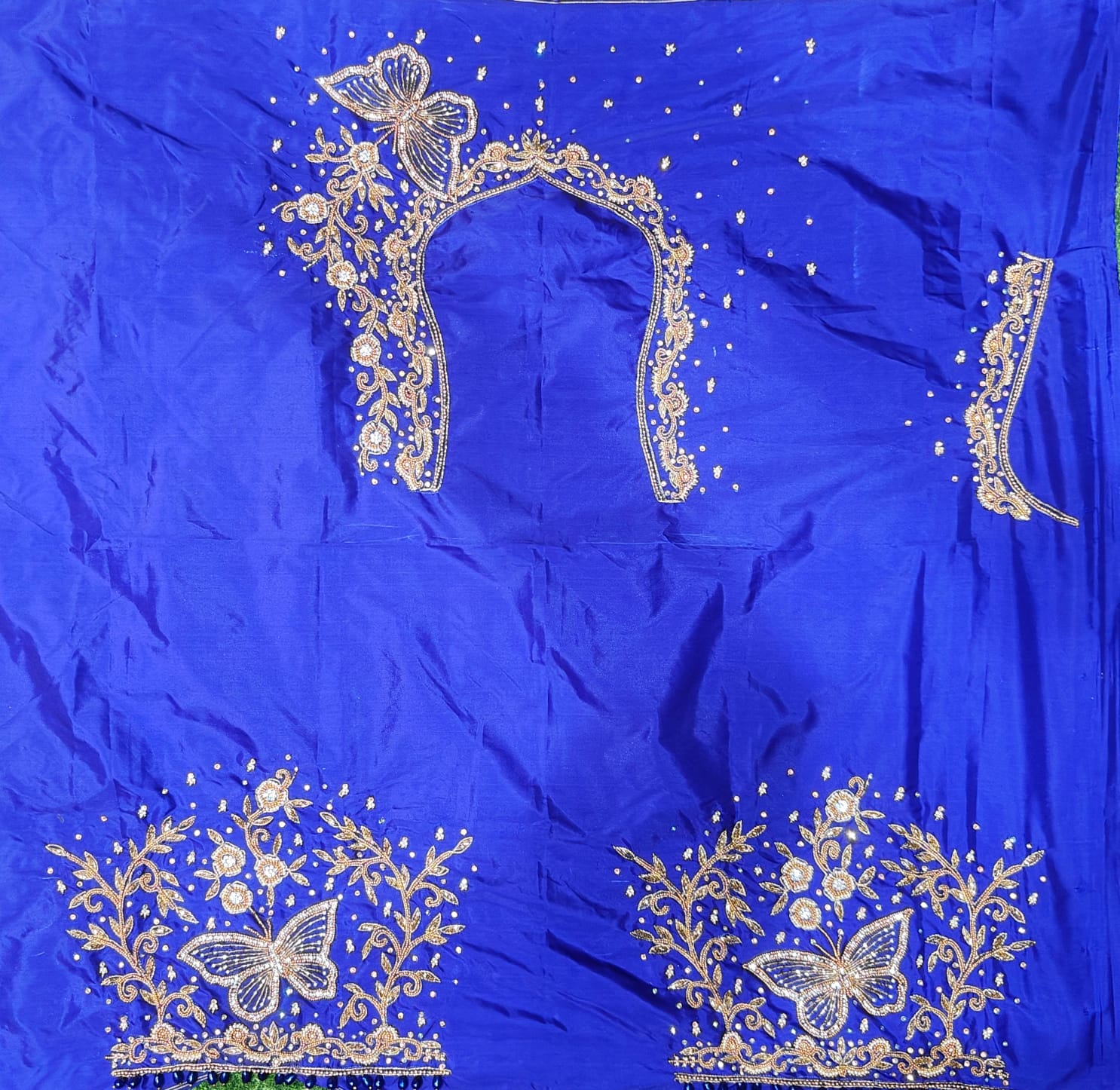 A butterfly maggam work blouse for marriage is an elegant bridal or festive garment featuring intricate hand embroidery using the Aari technique, centered around delicate butterfly motifs. This design is popular for weddings as it symbolizes transformation and grace.